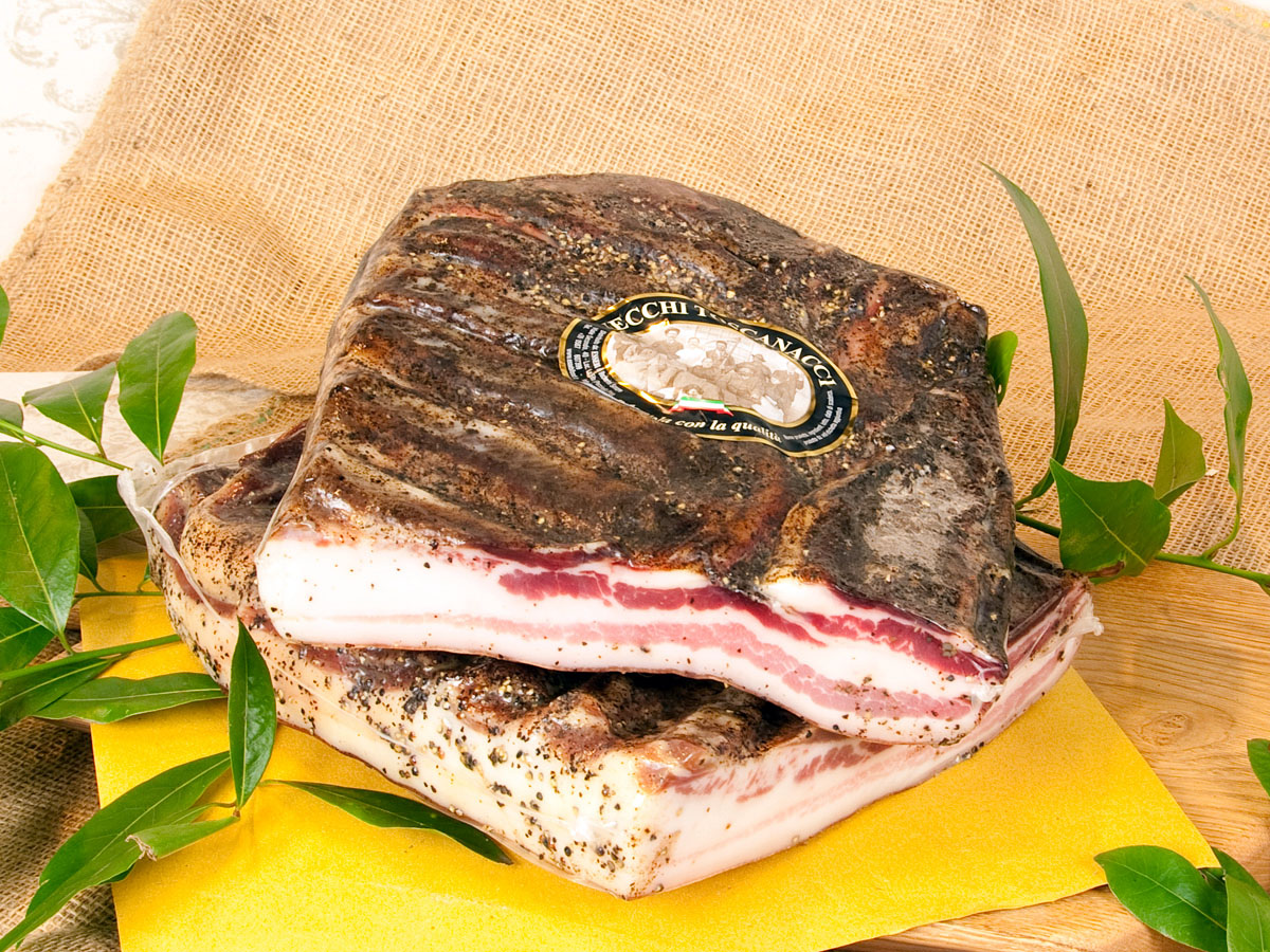 Pancetta di suino nazionale toelettata a mano e sottoposta ad accurata salagione con sale, spezie ed erbe officinali per un breve periodo di tempo. A salagione ultimata la pancetta viene lavata dal sale, scotennata ed ulteriormente toelettata per poi essere condita con erbe officinali ed arrotolata doppia in involucro protettivo trasparente o con carta bianca. Stagionatura in cantina sufficientemente asciutta per trenta-quaranta giorni. Ottima per piatti freddi antipasti e merende.