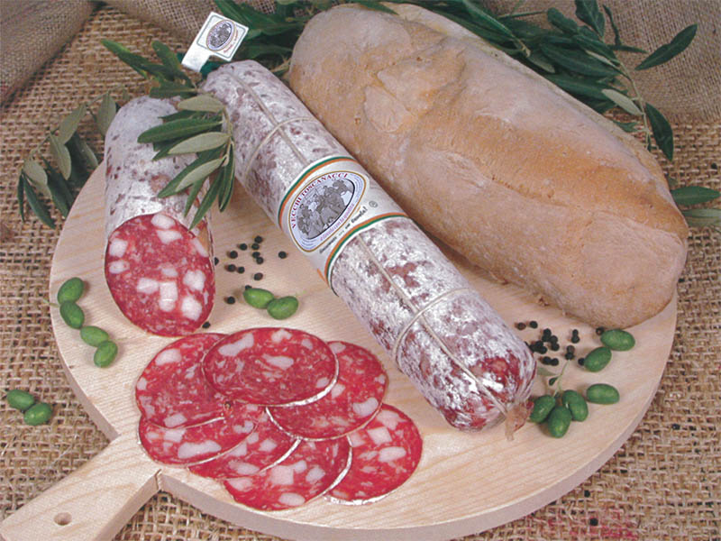 Salame tipico della nostra regione si ottiene con carni magre di suino di prima scelta, mondate amano e macinate a grana fine tanto da rendere l’impasto uniforme, al quale si aggiungono poi cubetti di lardo. La concia composta da pepe, sale ed un pizzico di spezia viene aromatizzata ulteriormente con quel poco aglio messo a macerare nel buon vino toscano.